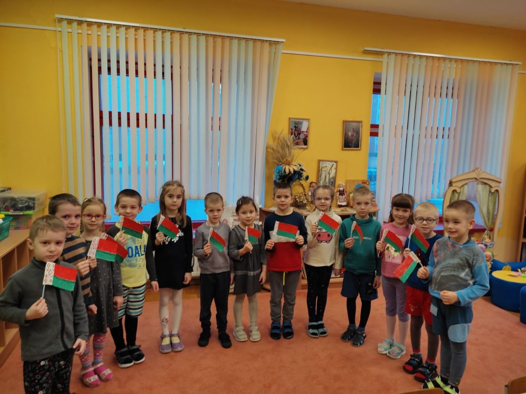 Для юного гражданина, патриота своего Отечества, нет ничего дороже флага родной страны. Ведь флаг — это отражение величия и красоты родной земли, преемственности исторических традиций и неразрывной связи прошлого, настоящего и будущего страны, мирного, созидательного характера белорусов. В старшей группе юные дизайнеры под руководством воспитателя Ирины Григорьевны Азарёнок изготовили флаги Республики Беларусь. Глядя на результат своей работы дети ощутили себя неотъемлемой частью единой большой семьи, имя которой — белорусский народ.