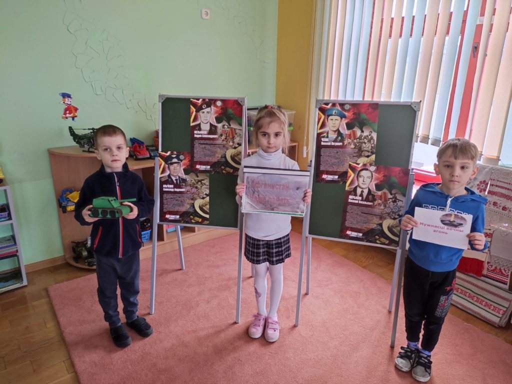Воспитанники старшей группы подготовили выставку-инсталляцию «Мужества вечный огонь», прослушали стихи и песни. Родители смогли ознакомиться с наглядной информацией, просмотреть папку с материалом «В их жизни был Афганистан».