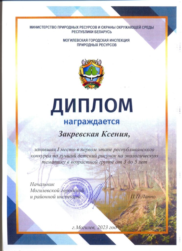 Закревская Ксения, воспитанница средней группы № 5, приняла участие в республиканском конкурс на лучший детский рисунок на экологическую тематику в номинации «Возрастная группа от 3 до 5 лет», который проводила Могилевская городская инспекция природных ресурсов и охраны окружающей среды.