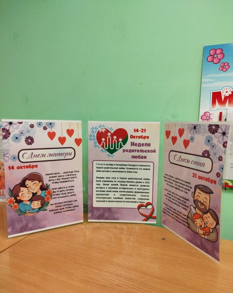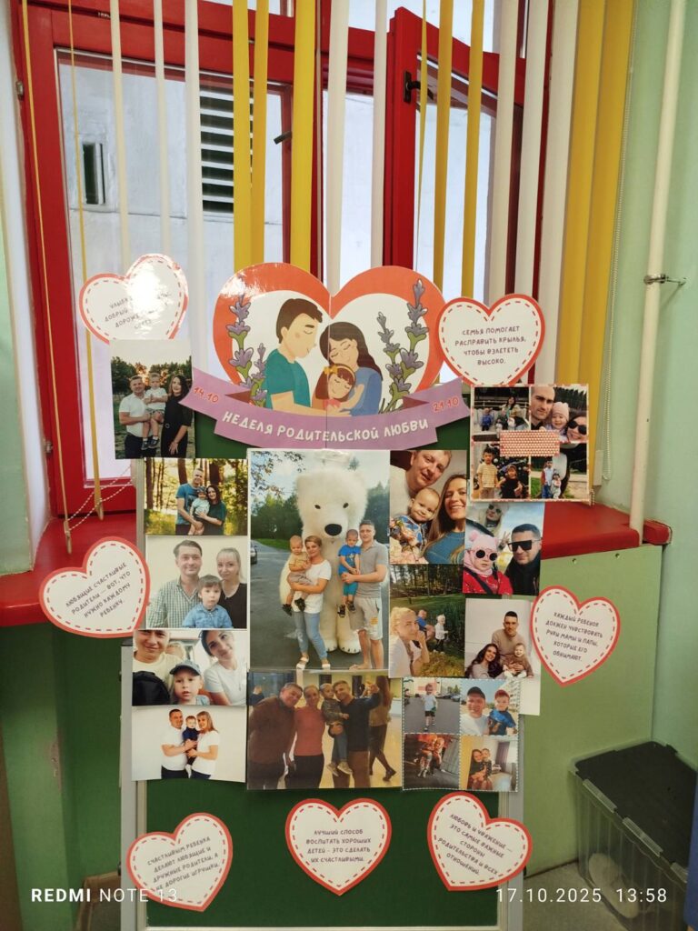 В нашем детском саду в период с 14.10.2025 по 21.10.2025 проведена тематическая неделя «Неделя родительской любви» с целью укрепления семейных ценностей, повышения роли родителей в воспитании детей, создания атмосферы взаимопонимания и уважения в семье. В каждой возрастной группе оформлены поздравительных открыток ко Дню матери и Дню отца. С воспитанниками проведены тематические беседы на темы «Наша семья», «Моя семья – моя крепость», «Счастливые моменты вместе», дидактические и сюжетно-ролевые игры «Моя семья», «Мой дом» и др., выставки детских творческих работ «Для моей мамочки», «Мой папа самый лучший», музыкальные развлечения «Папа — лучший друг», «Мамины помощники». Для родителей оформлены буклеты «Неделя родительской любви», рекомендации «Семейные традиции», проведена консультация «Воспитание любовью».