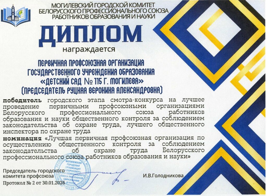 19 марта 2026 года состоялось торжественное мероприятие, посвященное 105-летию Белорусского профессионального союза работников образования и науки, где председателю ППО ГУО «Детский сад №115 г. Могилева» вручили диплом победителя городского этапа смотра — конкурса «Лучшая первичная профсоюзная организация по осуществлению общественного контроля за соблюдением законодательства об охране труда Белорусского профессионального союза работников образования и науки»